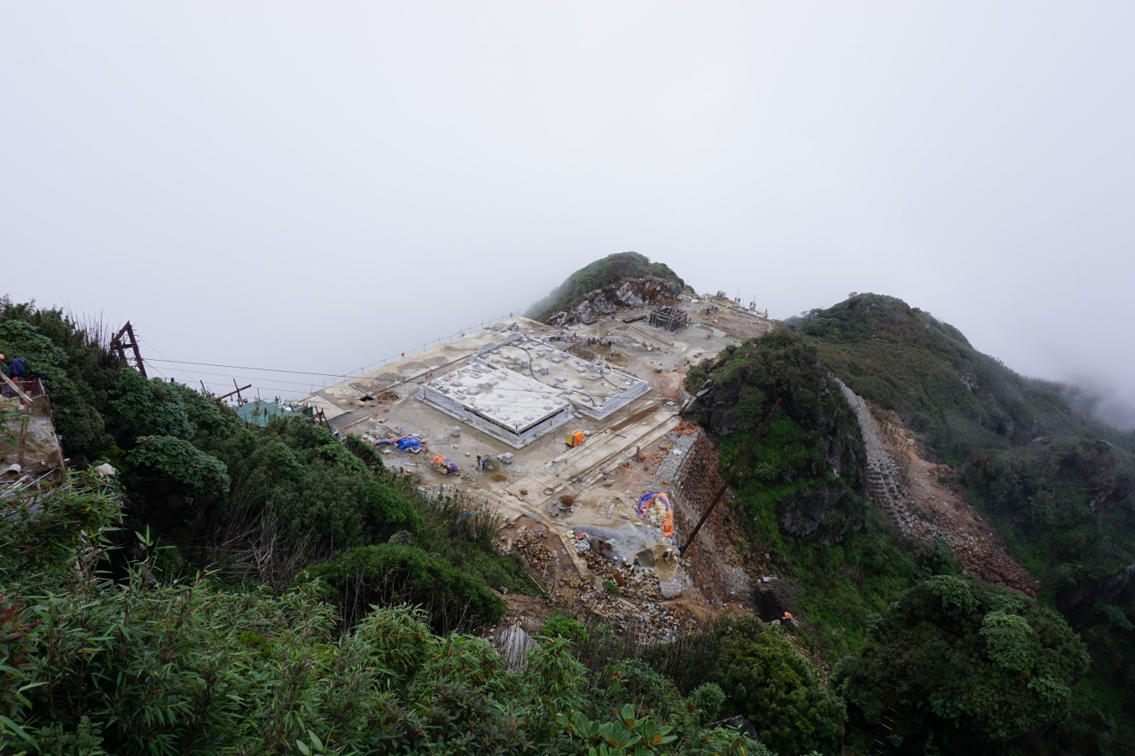 Our guide wanted to stay here for twenty minutes but we insisted on pushing on after five, twenty minutes later we started descending (this is before the actual false summit), losing about 100m of height before the final climb up. From here on things deteriorated (in our opinion), general building waste was strewn about the hillside and where the path had been diverted, the new path was so poorly constructed, particularly through a boggy section, that I can’t see it lasting.