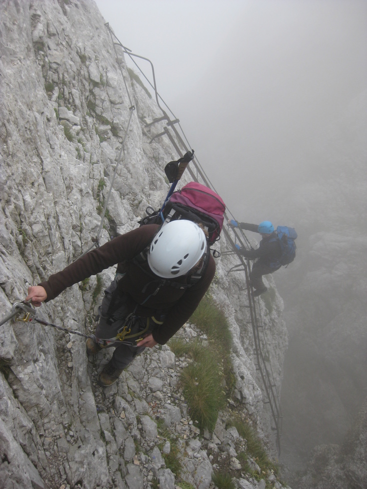 Unfortunately, the minute we stepped onto the first set of ladders, the mist turned to rain. I rapidly discovered that via ferratas in the rain are quite slippery, with my boots providing next to no traction on the metalwork or the limestone slabs. On more than one occasion my feet vanished from under me and I slithered down the slabs until my cowstails caught me.