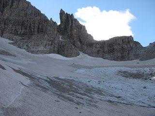 For several metres above the climb, things appeared to be just has difficult and exposed, but eventually we found ourselves scrambling more easily up a huge rocky bowl, following a line of cairns. An hour later we were stood at the 3173m snowy summit of Cima Tosa. A gully to one side afforded a view of Rifugio al Brentei, a kilometre below. To the north, the Marmolada range was visible.