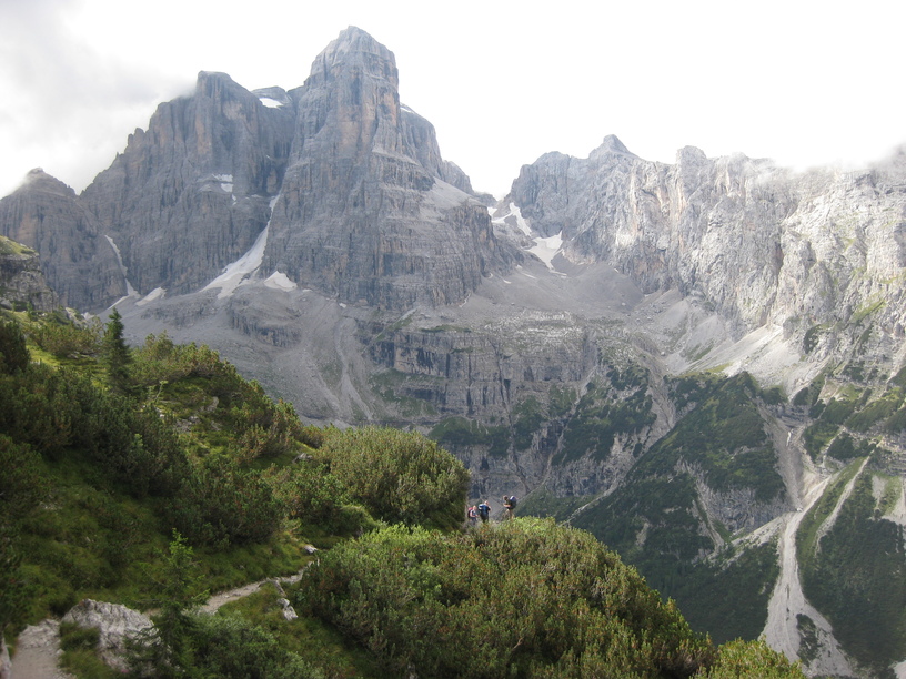 Day three greeted us with clear skies. The true majesty of the Dolomites was revealed: huge views of wooded valleys kilometres below, and limestone pillars soaring above into eddying clouds. But as we walked along the Sentiero Brentari, above a rubble moonscape, something was preying heavily on my mind…