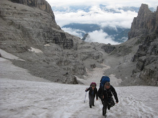 The next stretch of via ferrata led along another series of mid-cliff ledges to a suite of ladders down onto the icy Vedretta d’Ambies. After slithering past a couple of small crevasses, a fair chunk of height was lost, only to be gained again with a sweaty walk above the Rifugio Agostini.